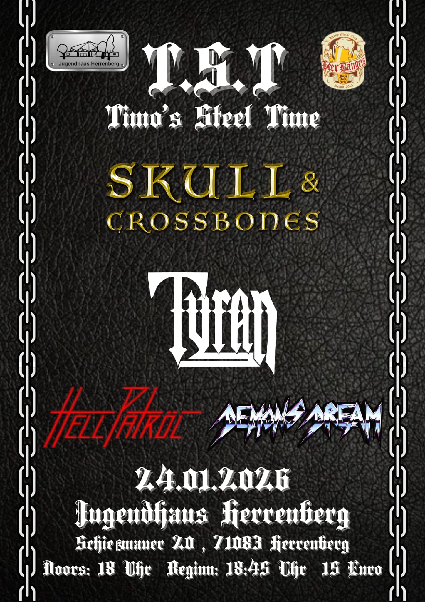 2026Sa. 14.03.2026CambometalKemptenPlakatSa. 28.03.2026VAZBurglengenfeld (BY)PlakatFr. 24.04.2026ReuterstübleLeibertingen/ThalheimSa. 25.04.2026Metal GarageHochspeyerSa. 27.06.2026Sicking High Rock Open AirWeselbergPlakatSa. 11.07.2026Dalmstöckle Open AirLeutenbach (BW)Sa. 24.10.2026Gasthof Adler Horb am Neckarmit Vanish + Black Leaf Draft--------------------------------------------------------------------------------------------------------------------------------------------------------PastSa. 21.02.2026Beat BarackeLeonbergPlakatmit Chinchilla und BullshitSa. 24.01.2026T.S.T JugendhausHerrenbergPlakat27./28.12.2025No Sleep After X-Mas Festival - StadthalleRunkelPlakatSa. 20.12.2025RittersburgSchauenburg (bei Kassel)PlakatFr. 28.11.2025Sonnenkeller Release Show mit ChinchillaBalingenPlakatSa. 22.11.2025Artik - (Support für Sacred Steel & Portraid)FreiburgPlakatSa. 15.11.2025Krone - This is Heavy Metal Part IIILackendorfPlakatDo. 02.10.2025RocknachtNagoldPlakatSa. 13.09.2025Treff 9 - Warm Up MetalnightHMHeidenheimPlakatSa. 06.09.2025Soundcheck OneWaldbronnPlakatSupport von „Q5“Sa. 19.07.2025BandliftGerstettenFr. 18.07.2025Kloster Open Air IIVillingen/SchwenningenPlakatSa. 24.05.2025Metal Mountain Festival II - JurahalleGosheimPlakatSa. 17.05.2025Alte MühleFilderstadtPlakatSa. 22.03.2025s´ BokleRadolfzellPlakatSa. 21.12.2024SteinhausHorb am NeckarPlakatSa. 14.12.2024Treff 9 Heidenheim/Brenz PlakatTriple-Gig mit unseren Freunden vonBlack & Damned&Enslave the chainSa. 23.11.2024RVB Adventsingen EberthalleBalingen PlakatFr. 11.10.2024Lemmy´s BarBad FriedrichshallSa. 05.10.2024Rock im MadertalHaigerloch-WeildorfINFOSa. 28.09.2024Metalnight Vol IIIHohenmemmingenINFOPlakatSa. 10.08.2024.Wellesweiler Open AirWellesweilerSa. 13.07.2024RVBANG FestivalBalingenINFOPlakatSa. 06.07.2024Double StageNagoldFr. 24.05.2024Sonnenkeller - Live ClubBalingenPlakatSa. 01.06.2024Support von „Wings of SteelSa. 25.05.2024Soundcheck OneWaldbronnINFOPlakatSupport von „Wings of Steel“Sa. 24.02.2024Sonnenkeller - Live ClubBalingenINFOPlakatSa. 09.12.2023Marmorwek MittelbauHorb am NeckarPlakatSa. 16.09.2023Schlicker (Release Party)Gerstetten/HeuchlingenPlakatSa. 09.09.2023U&D Zollernalb - Festplatz BisingenBisingenSo. 30.04.2023Night of the witches - SchranneGiengen/BrenzPlakat